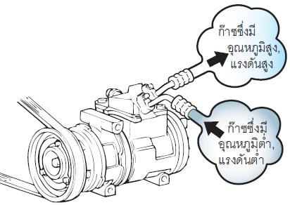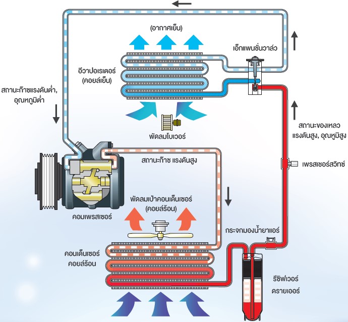 การทำงานของระบบแอร์รถยนต์ จะดำเนินการในลักษณะนี้ต่อไปเรื่อยๆ เราจะเห็นได้ว่าคอมเพรสเซอร์ (Compressor) นั้นเป็นอุปกรณ์สำคัญในการเริ่มวงจรของการอัดสารทำความเย็นเข้าไปในระบบ เพื่อทำให้เกิดการแลกเปลี่ยนความร้อน และปล่อยอากาศที่มีอุณหภูมิที่เหมาะสมแก่ผู้โดยสาร ภายในห้องโดยสาร